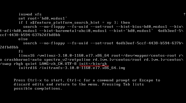 进去之后,找到以linux16开头的句子,在其末尾添加 init=/bin/sh